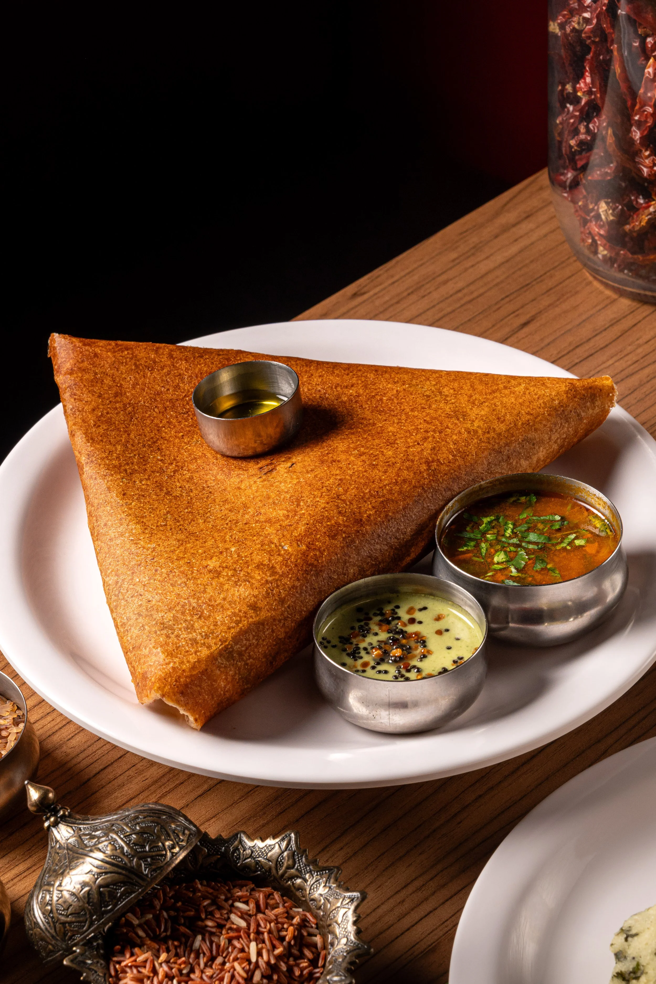 Golden dosa with a generous dollop of butter, stuffed with spicy potato. Rich, indulgent, and deeply satisfying.